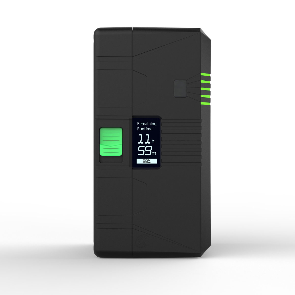 Anders als bei den 98Wh und 150Wh Modellen der Helix Reihe, ist das Display etwas kleiner und an der Seite des Akkus angebracht. Die Informationen sind aber die gleichen. Zur schnelleren Orientierung wurden an der Front links und rechts zusätzlich 5 Leuchtdioden im Gehäuse integriert. So bekommt man auch von weitem einen groben Überblick zum Ladezustand.
