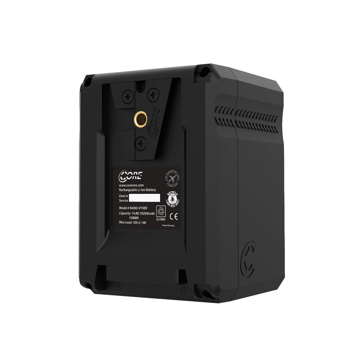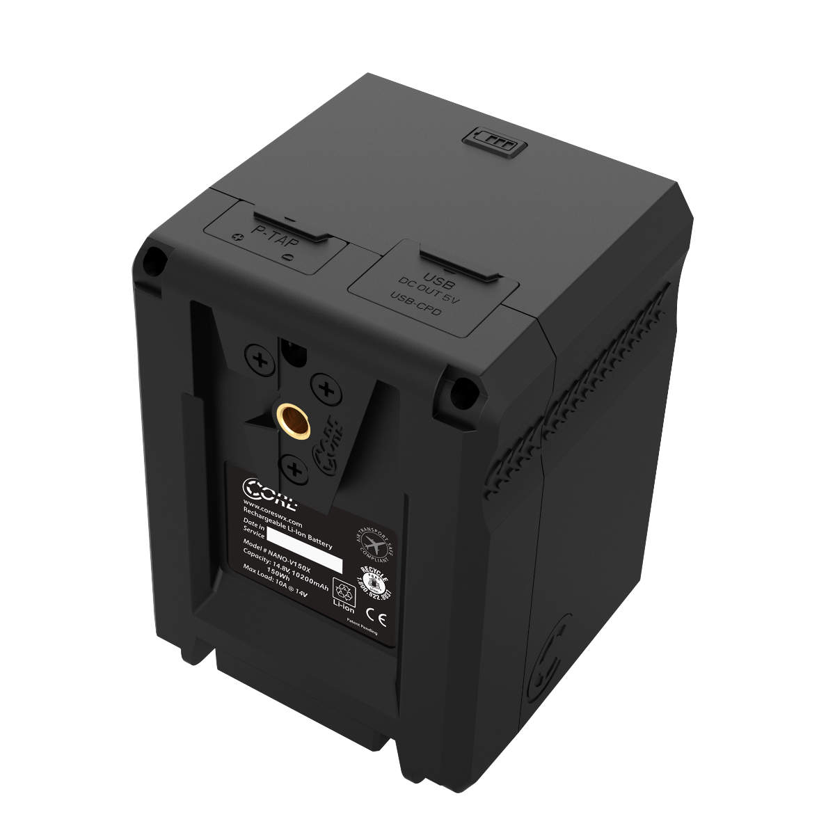 Der Nano-V150X ist ein kompakter V-Mount Akku mit einer Kapazität von 147Wh. Zur Stromversorgung von Zubehör wurden an der Oberseite ein D-Tap und ein USB-C Port verbaut. Der USB-C Port funktioniert als Ein- und Ausgang. Du kannst den Akku einfach über ein USB-Kabel laden und als Powerbank für dein Notebook nutzen.