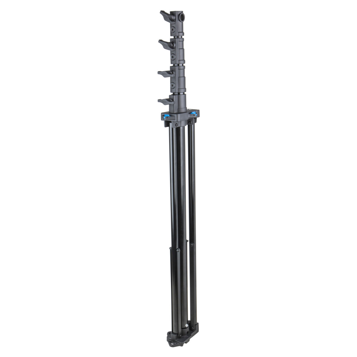 Schwerlaststativ mit Kurbel und Automatik-SperreDieses zuverlässige und robuste Kurbelstativ ist die ideale Lösung für professionelle Fotografen und Videografen, die schwere Beleuchtung, Diffusoren oder technisches Equipment sicher und mühelos anheben möchten. Mit einer beeindruckenden Traglast von bis zu 30 kg und einer maximalen Höhe von 380 cm ist das Stahlstativ perfekt für anspruchsvolle Studio- und Außeneinsätze geeignet. Die Kurbel mit automatischer Selbstsperrung garantiert dabei höchste Sicherheit und präzise Höheneinstellung.Technische Eckdaten2 Steigrohre, 3 SektionenDurchmesser Mittelsäulen: 55 mm, 45 mm, 38 mm Durchmesser Standbeine: 30 mmOberfläche: Schwarz pulverbeschichtet Material: Stahl Belastbarkeit: 30 kg (66,1 lbs) Geschlossene Länge: 181 cm (71,3") Mindestarbeitshöhe: 172,5 cm (67,9") Maximale Höhe: 380 cm (149,7") Aufstellfläche: 128 cm (50,4") Stativkopf: Universal-Stativkopf mit Junior- (1 1/8") und Baby-Aufnahme (5/8") und einem Baby-Zapfen (5/8") Nivellierbein: Gleicht Unebenheiten im Gelände aus und sorgt für sicheren Stand. Empfohlene Rollen: KC-100 Optionales Stativ-Pad: 483-BPGewicht: 22,8 kg (50,2 lbs)Besondere MerkmaleSehr hohe Tragkraft: Unterstützt Equipment bis zu 30 kg (66.1 lbs). Sehr hoch: Erreicht eine Arbeitshöhe von bis zu 380 cm (149.7"). Komfortable Höhenverstellung: Einfaches Anheben und Absenken per Kurbel, mit präziser Einstellung von 44 mm pro Umdrehung. Automatischer Sperrmechanismus: Selbstsperrende Funktion des Kurbelgriffs verhindert ein versehentliches Absinken der Last. TÜV ZertifiziertMultifunktional: Geeignet für Beleuchtung, aber auch für Funksender, Anti-Drohnen-Systeme, Radardetektoren und Überwachungskameras. LieferumfangStativ (Schwarz) Universal-Standkopf mit Junior- und Baby-Aufnahme sowie Baby Stud Nivellierbein (integriert)rutschfest TrittstufeArtikelnr.: 483BT EAN.: 6954016560697