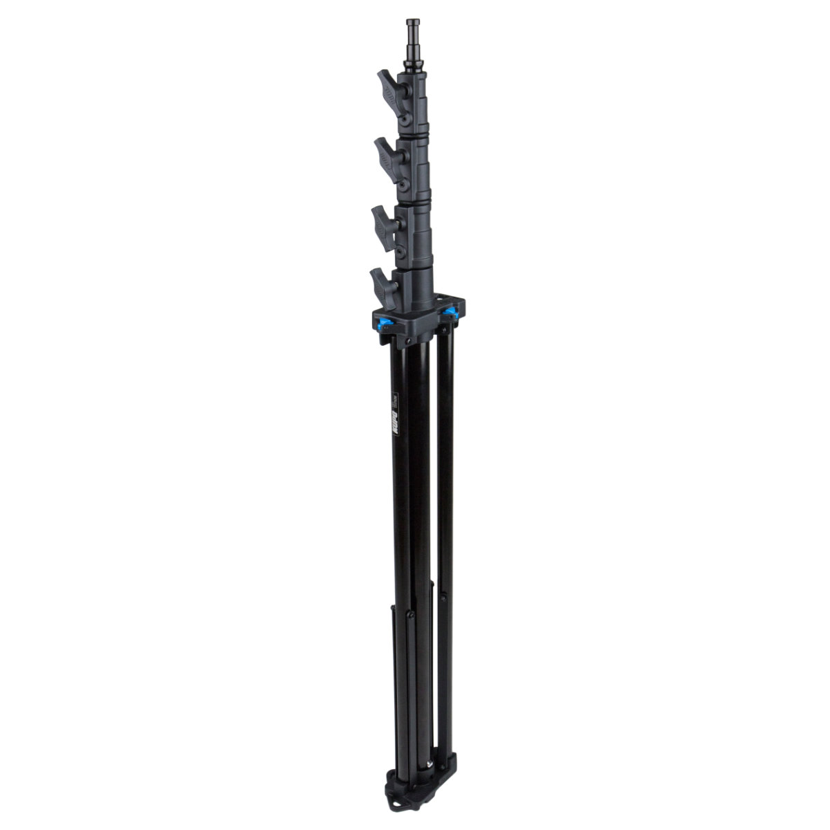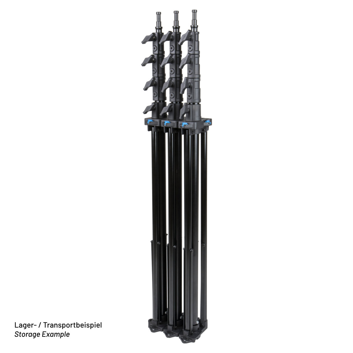 Schwerlaststativ mit Kurbel und Automatik-SperreDieses zuverlässige und robuste Kurbelstativ ist die ideale Lösung für professionelle Fotografen und Videografen, die schwere Beleuchtung, Diffusoren oder technisches Equipment sicher und mühelos anheben möchten. Mit einer beeindruckenden Traglast von bis zu 30 kg und einer maximalen Höhe von 380 cm ist das Stahlstativ perfekt für anspruchsvolle Studio- und Außeneinsätze geeignet. Die Kurbel mit automatischer Selbstsperrung garantiert dabei höchste Sicherheit und präzise Höheneinstellung.Technische Eckdaten2 Steigrohre, 3 SektionenDurchmesser Mittelsäulen: 55 mm, 45 mm, 38 mm Durchmesser Standbeine: 30 mmOberfläche: Schwarz pulverbeschichtet Material: Stahl Belastbarkeit: 30 kg (66,1 lbs) Geschlossene Länge: 181 cm (71,3") Mindestarbeitshöhe: 172,5 cm (67,9") Maximale Höhe: 380 cm (149,7") Aufstellfläche: 128 cm (50,4") Stativkopf: Universal-Stativkopf mit Junior- (1 1/8") und Baby-Aufnahme (5/8") und einem Baby-Zapfen (5/8") Nivellierbein: Gleicht Unebenheiten im Gelände aus und sorgt für sicheren Stand. Empfohlene Rollen: KC-100 Optionales Stativ-Pad: 483-BPGewicht: 22,8 kg (50,2 lbs)Besondere MerkmaleSehr hohe Tragkraft: Unterstützt Equipment bis zu 30 kg (66.1 lbs). Sehr hoch: Erreicht eine Arbeitshöhe von bis zu 380 cm (149.7"). Komfortable Höhenverstellung: Einfaches Anheben und Absenken per Kurbel, mit präziser Einstellung von 44 mm pro Umdrehung. Automatischer Sperrmechanismus: Selbstsperrende Funktion des Kurbelgriffs verhindert ein versehentliches Absinken der Last. TÜV ZertifiziertMultifunktional: Geeignet für Beleuchtung, aber auch für Funksender, Anti-Drohnen-Systeme, Radardetektoren und Überwachungskameras. LieferumfangStativ (Schwarz) Universal-Standkopf mit Junior- und Baby-Aufnahme sowie Baby Stud Nivellierbein (integriert)rutschfest TrittstufeArtikelnr.: 483BT EAN.: 6954016560697