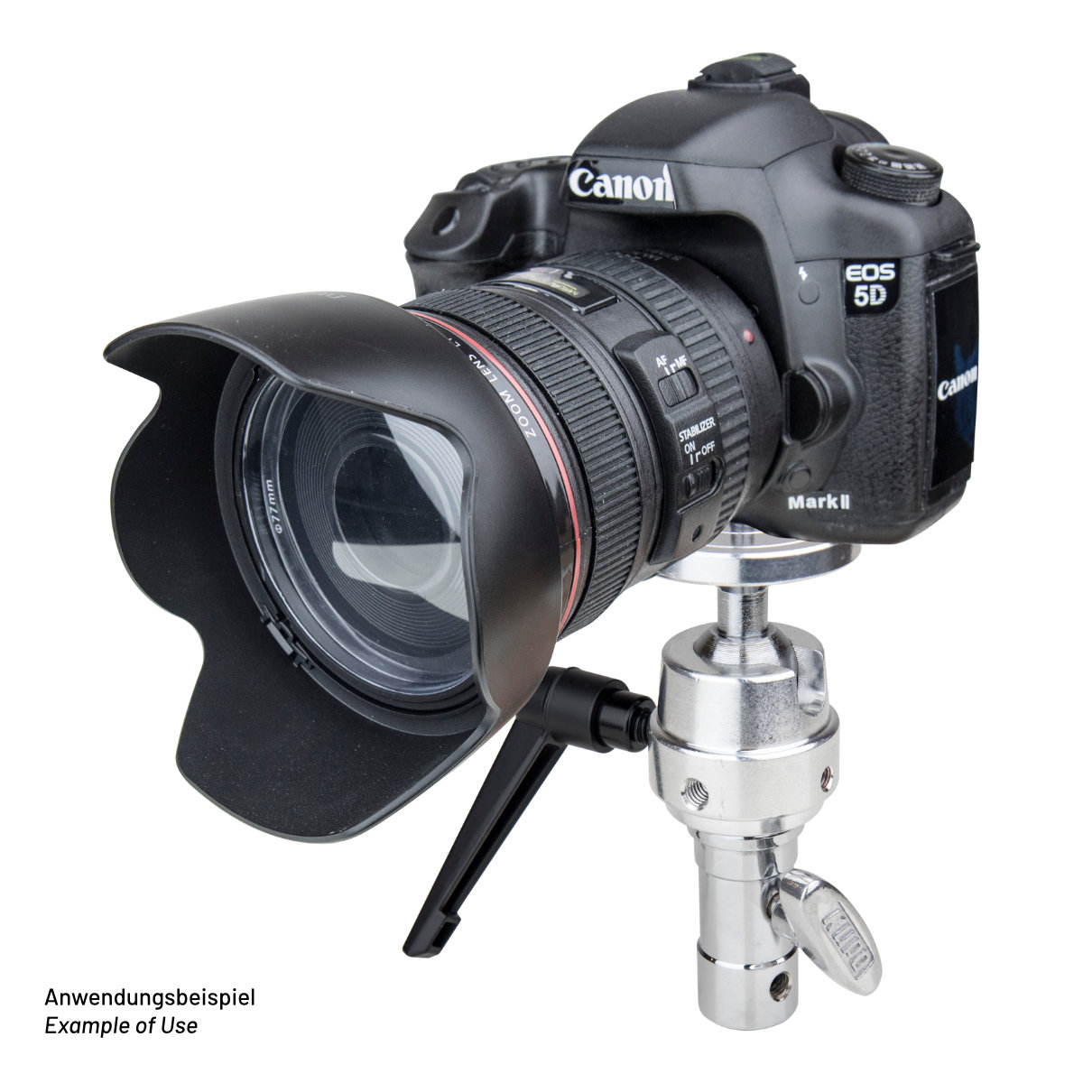 - Schwenkbarer Kugelkopf mit 1/4"-20 Außengewinde und runder Kameraplatte
