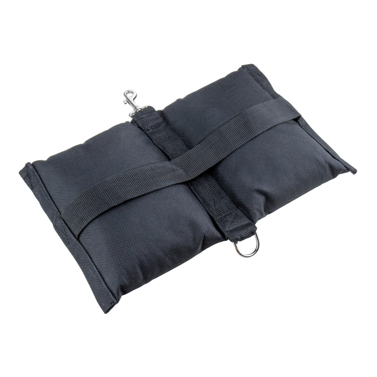 - Öse und Karabinerhaken geben flexible Möglichkeiten, den Sandsack am Stativ sicher zu befestigen