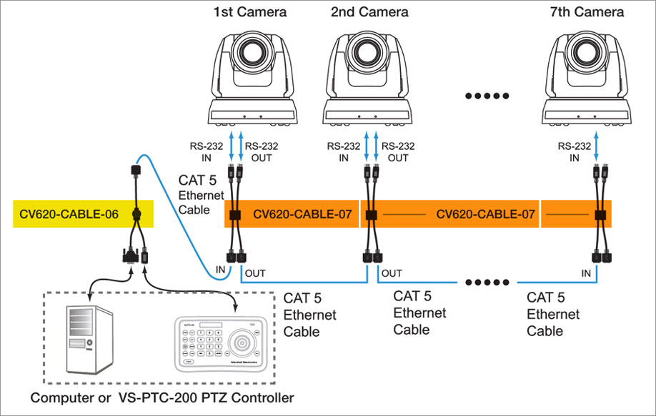 Das CV620-Cable-06 benötigen Sie, um den Controller VS-PTC-200 mit PTZ Kameras über ein Netzwerkkabel zu steuern.