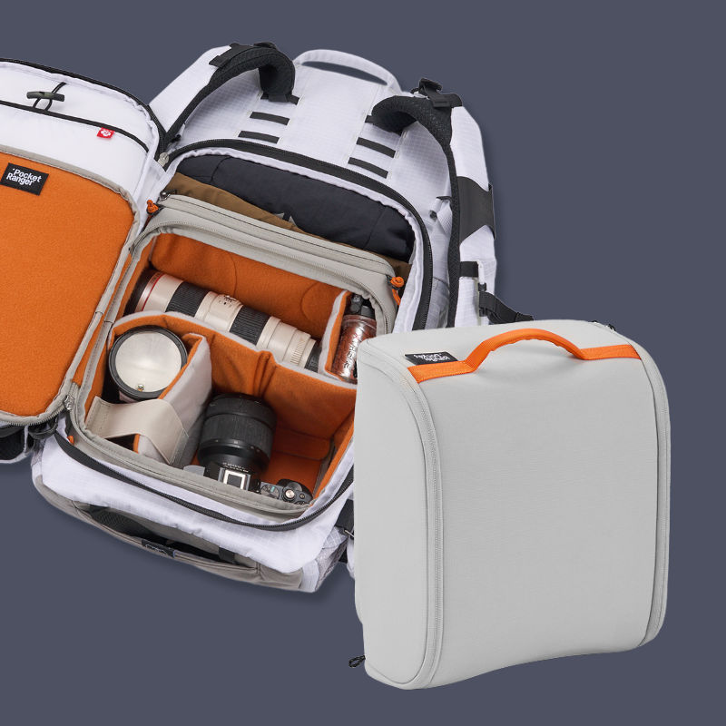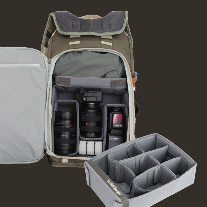 Outdoor- & Kamerarucksack mit 25+8L KapazitätDer Pocket Ranger ist ein vielseitiger Outdoor-Rucksack mit herausnehmbarem, modularem Kamera-Inlay. Durch seine cleveren Öffnungssysteme bietet er ultraschnellen Zugriff auf Kamera, Objektive oder Zubehör – die Ausrüstung ist gut geschützt, ordentlich verstaut und jederzeit griffbereit. Ideal für Fotografen und Abenteurer, die unterwegs keine Kompromisse eingehen wollen. Varianten: Er ist in zwei Größen erhältlich. (Jeweils in cremeweiß/olivgrün und marine-blau.) Hier die Kapazitäten im Vergleich:25L Variante: für ca. 1 Kamerabody + 1–3 Objektive + Drohne 35L Variante: für 1–2 Kamerabodies + 3–5 Objektive + Drohne + Zubehör Highlights und MerkmaleFarbe: cremeweiß und olivgrünKapazität: 25L + 8L (also durch flexible Verschlussmechanik erweiterbar auf 33L) Leicht, langlebig und vielseitig: Robustes 3-in-1-Schutzgewebe – wasser-, öl- und schmutzabweisendDrei Öffnungsmodi – halb geöffnet, vollständig geöffnet oder flach komprimiert Modulares Kameraeinsatz-System: Faltbarer, anpassbarer Inneneinsatz mit gepolsterten Trennwänden, kann herausgenommen werden Allwetter-Schutz: Inklusive Nylon-Regenhülle für extremen Regen Ergonomisches Tragesystem: EVA-Schaumrücken mit Belüftungslöchern, atmungsaktives Mesh, verstellbare Schulter-, Brust- und abnehmbare Hüftgurte Ausrüstungsbefestigungen: Seitentasche für Stativ, untere Gurte für Matte/Zelt, außenliegende Schlaufen für Trekkingstöcke, Lampen oder Zubehör Premium-Komponenten: Duraflex- & Fidlock-Schnallen, SBS-Wasserschutzreißverschlüsse und ein leichter Aluminiumrahmen für StabilitätTextilzusammensetzungObermaterial: 100 % PolyesterInnenmaterial: 100 % NylonZusätzliche MaterialinformationTeflon-Beschichtung, PVC- und PU-Rückseiten zur Verbesserung von Wasserfestigkeit, Strapazierfähigkeit, Staubschutz und Formstabilität.Wasserdichte SBS-Reißverschlüsse sowie Fidlock-, Duraflex- und Nifco-SchnallenRahmen aus leichter, und stabiler AluminiumlegierungRegenhülle aus NylonMaße und Gewicht30 × 54 × 18 cm 1,45kg ohne Inlay / 2,12kg mit Inlay LieferumfangRucksackModulares Kamera-Inlay Nylon-RegenhülleArtikelnr.: V-PR02EAN: 6939818809632