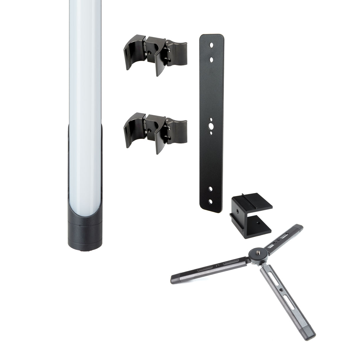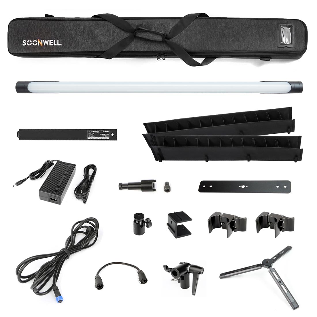 - 2x Richtgitter mit Gummizug und Klettverschluss. Die Richtgitter können miteinander verbunden werden. Zusammen decken sie die gesamte Länge der Leuchte ab.