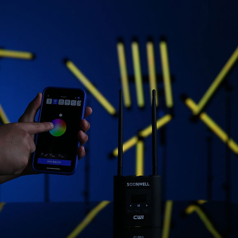 über DMX/Bluetooth-Adapter CW1 kann die Leuchte auch per App angesteuert werden (CW1 separat erhältlich, beim 4er-Kit inklusive)