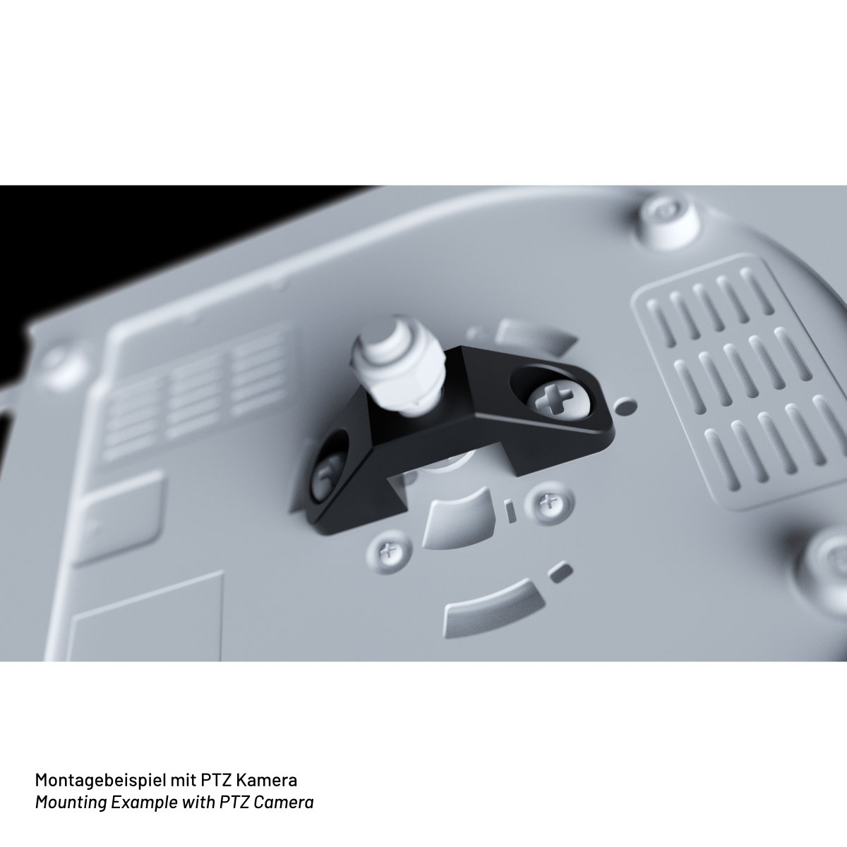 Der Telycam TLC-U16 ist ein Adapter zur Montage von PTZ-Kameras an Traversen in kopfüber hängender Position. Sie wird an der Unterseite der Kamera verschraubt. In Kombination mit einer Traversenschelle sorgt der Adapter für eine sichere und flexible Befestigung am Rohr der Traverse.