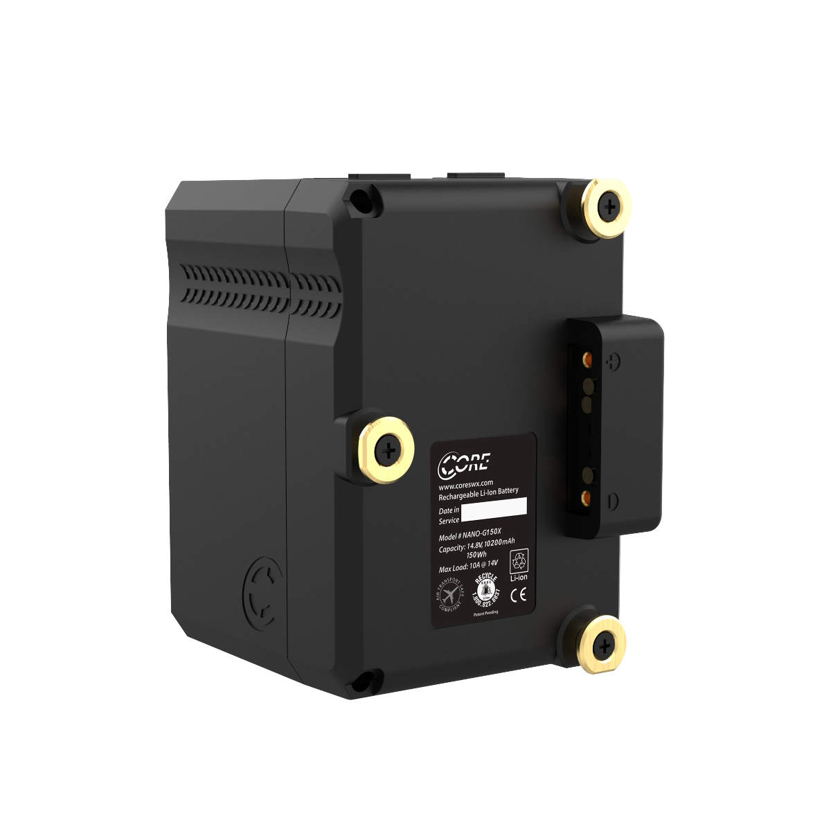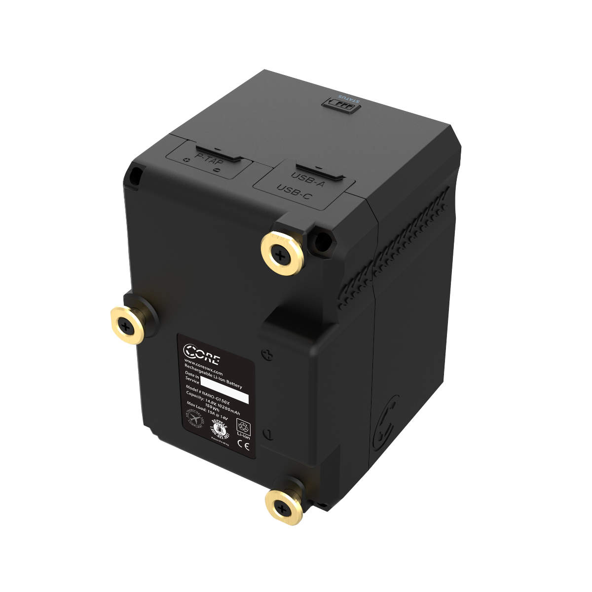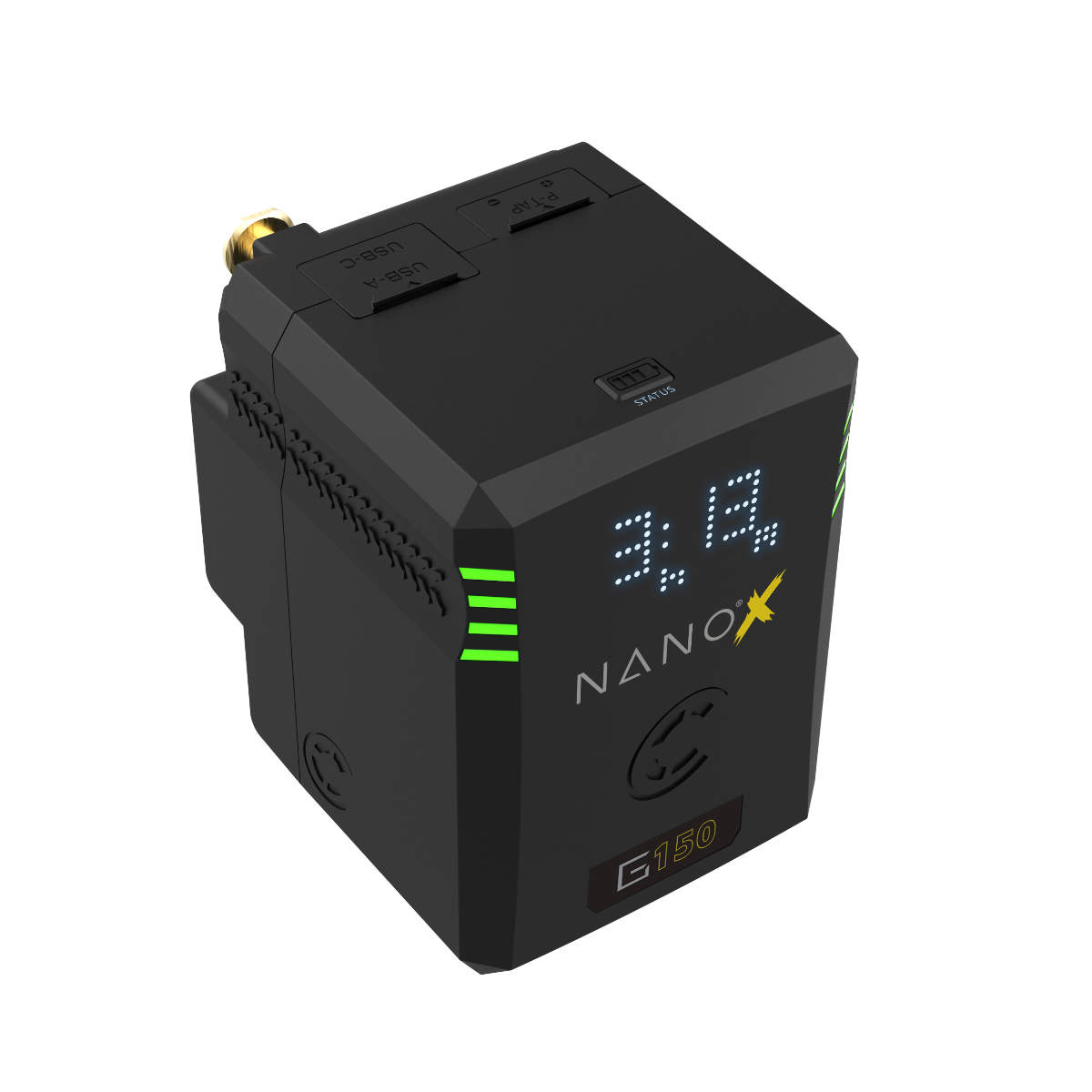 Der Nano-G150X ist ein kompakter Gold-Mount Akku mit einer Kapazität von 147Wh. Zur Stromversorgung von Zubehör wurden an der Oberseite ein D-Tap und ein USB-C Port verbaut. Der USB-C Port funktioniert als Ein- und Ausgang. Du kannst den Akku einfach über ein USB-Kabel laden und als Powerbank für dein Notebook nutzen.