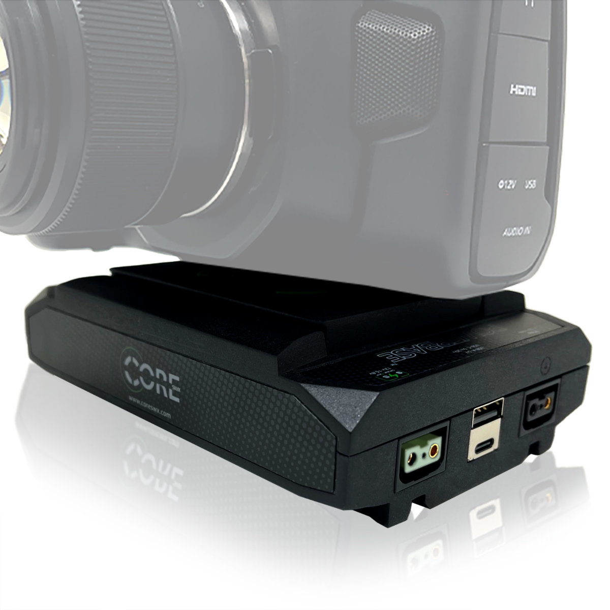 - Unter der Kamera montiert (Adapterplatte mitgeliefert). Das bietet sich bei kleineren Kameras an, die mit einem Gimbal in der Hand gehalten werden. In dem Fall kann die Kamera über D-Tap mit Strom versorgt werden